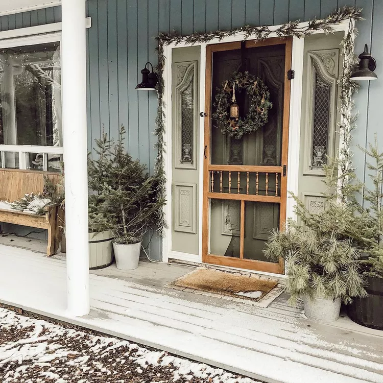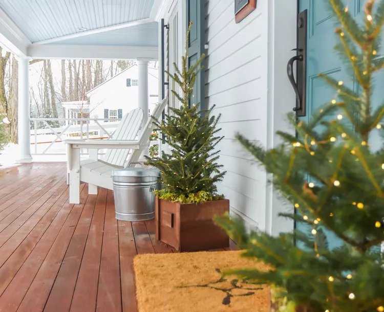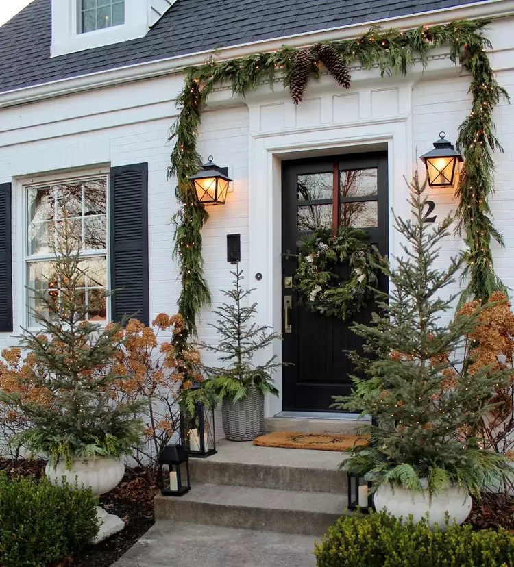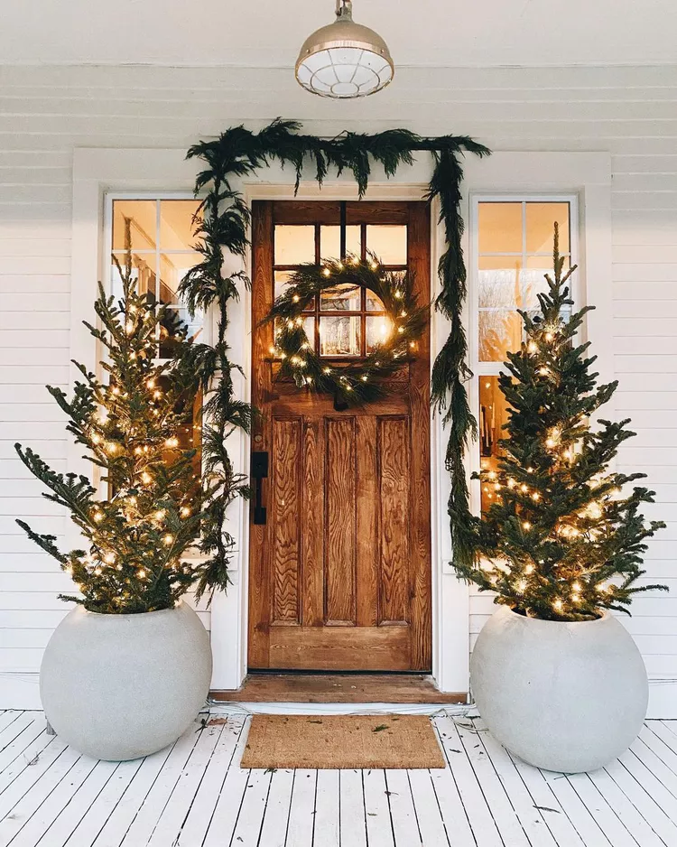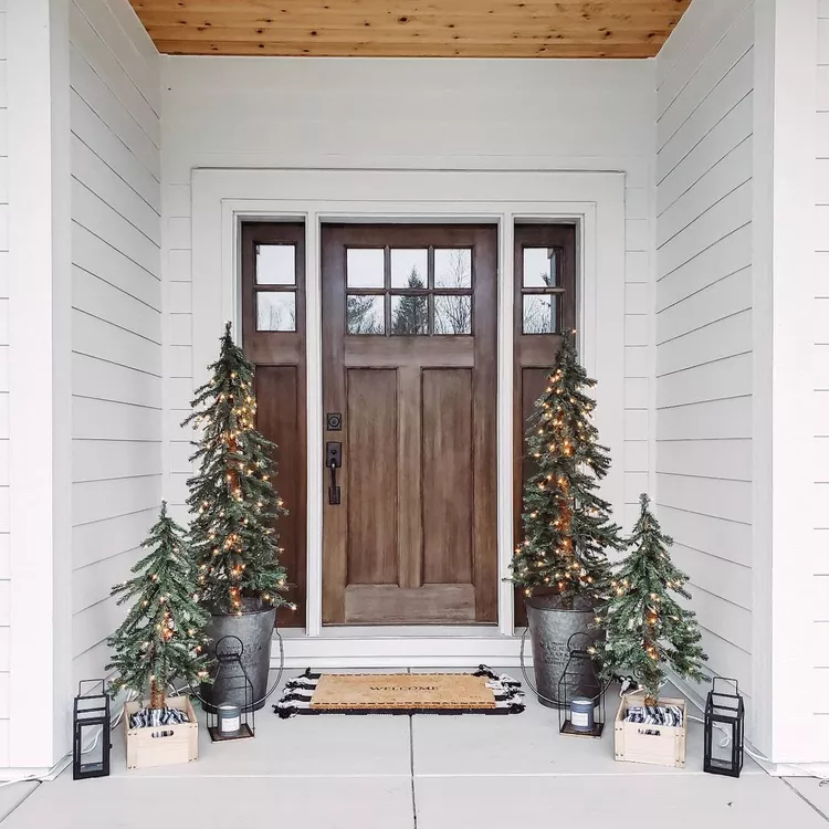 La decoración navideña para exteriores 2024 incluye flanquear tu puerta de entrada con dos mini árboles de Navidad para mejorar tu porche esta temporada. Puedes decorarlas con bombillas o mantener la sencillez y optar por luces. Solo asegúrate de elegir luces aptas para exteriores si quieres añadir ese brillo cálido.
