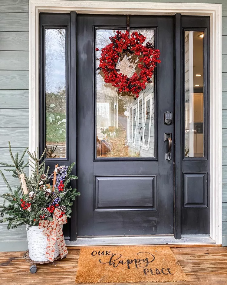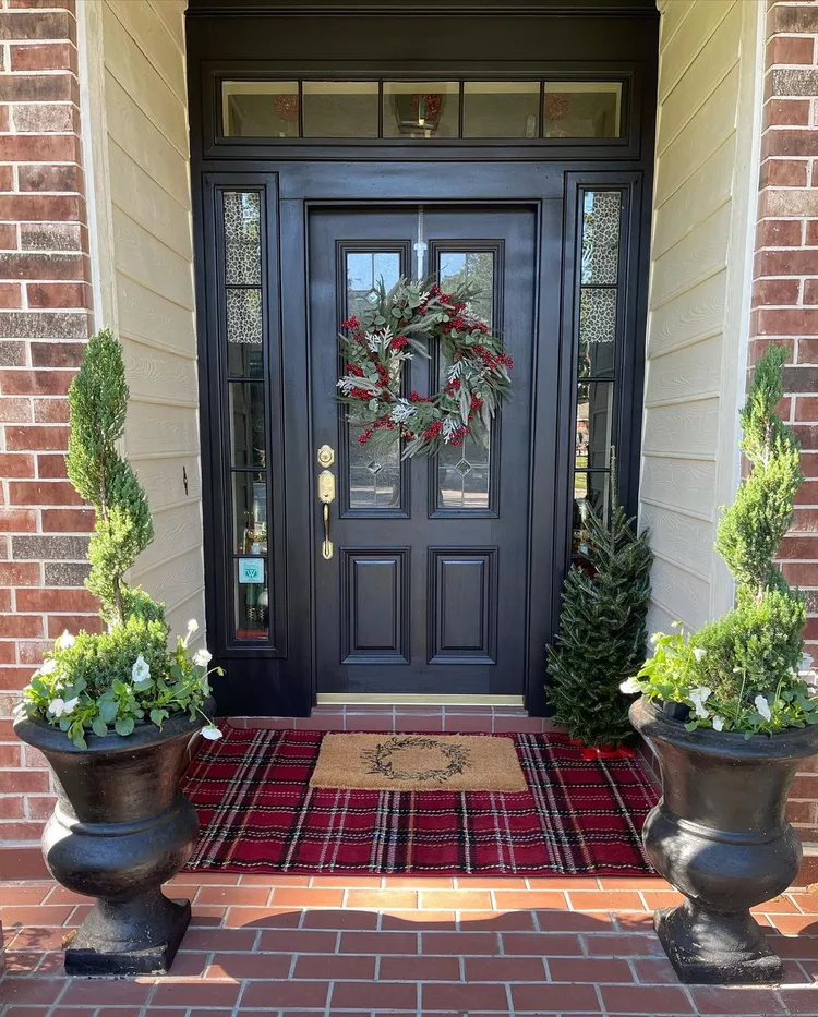 Una vez que hayas elegido un tema y una combinación de colores para la corona, piensa en tejerla por todo el porche delantero. Aquí, una corona adornada con detalles en rojo y plateado combina a la perfección con la alfombra de cuadros rojos de la entrada. Es una forma estupenda de hacer que la puerta de entrada parezca terminada sin mucho esfuerzo.