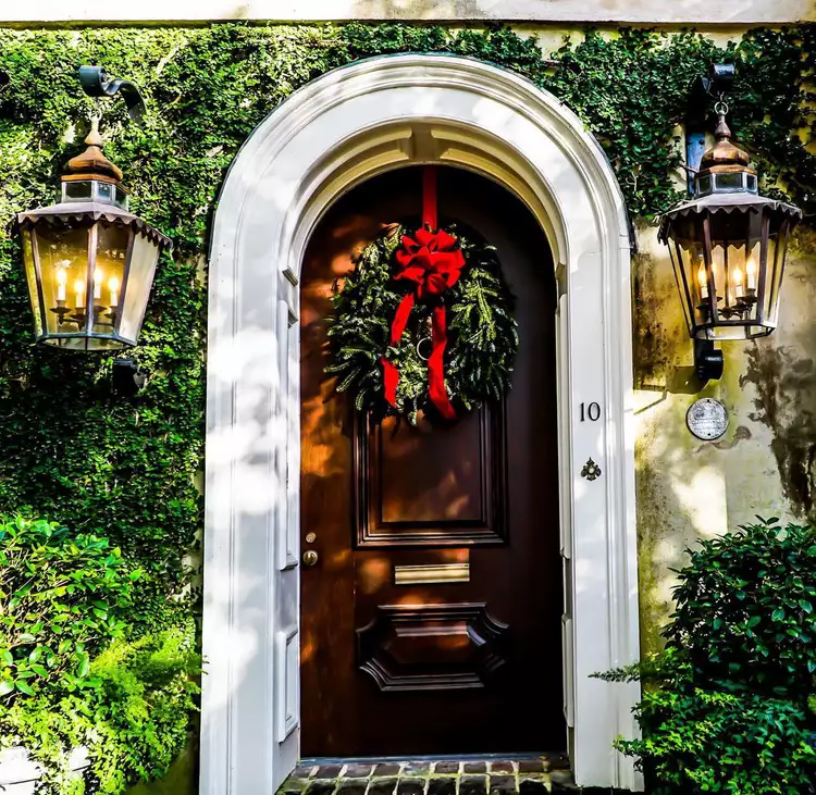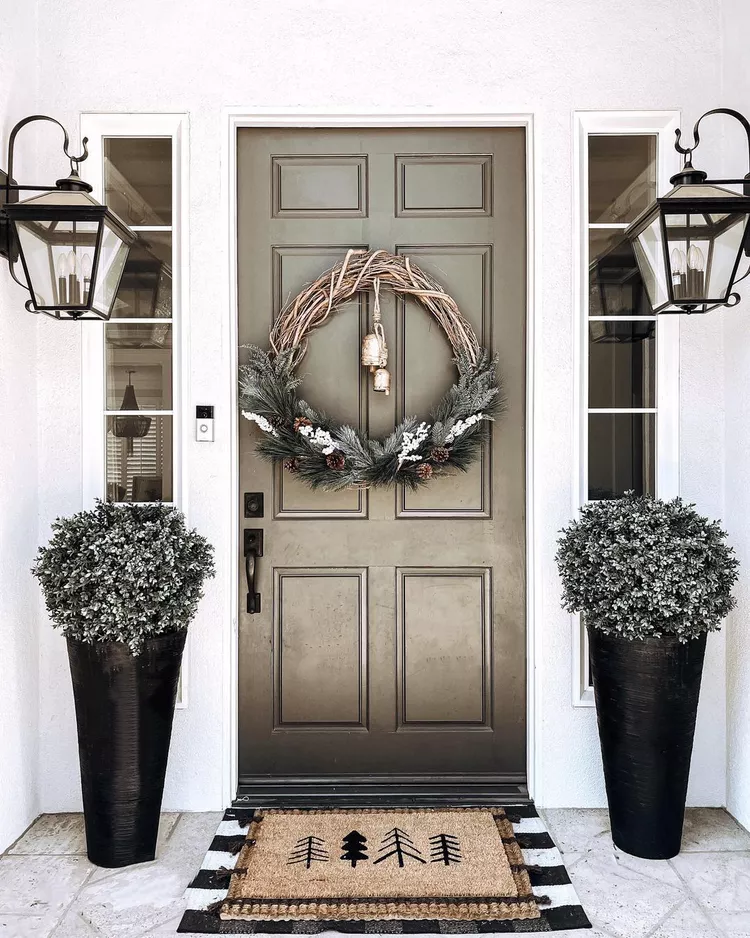 No hay nada de malo en optar por la decoración navideña tradicional que todos conocemos y amamos. Si tu exterior ya está adornado, a veces la mejor opción es mantener la decoración navideña simple. Una corona fresca de gran tamaño con un lazo grande o flores de Pascua falsas brinda la alegría navideña justa sin abrumar el espacio.
