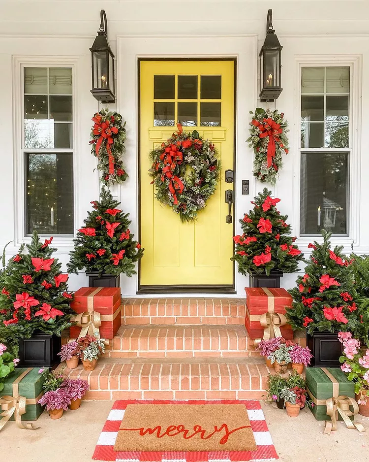 A veces, la mejor manera de comenzar a decorar para las fiestas es elegir un tema y seguirlo. Esta decoración navideña 2024 incluye lazos rojos y flores de Pascua rojas, una excelente manera de agregar un montón de color a tu porche delantero.