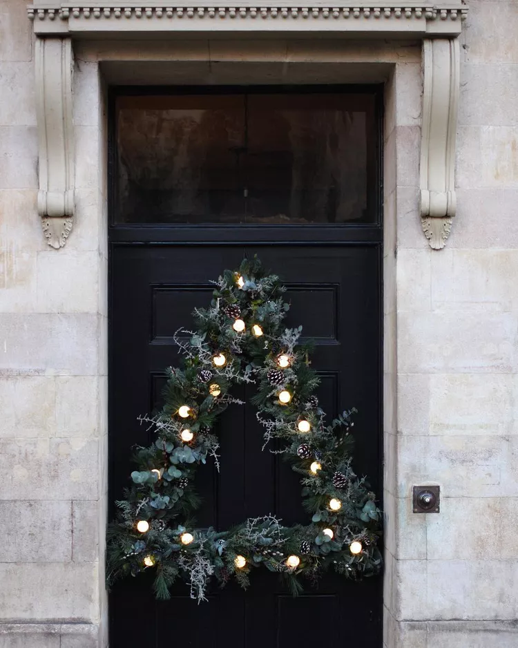 La iluminación blanca suave es, por lejos, una de las maneras más fáciles de agregar calidez y una sensación acogedora a cualquier espacio dentro o fuera de tu hogar. Decora tu puerta con árboles de Navidad y una corona con tiras de luces blancas. Si tu puerta de entrada está cubierta, puedes encontrar luces que funcionen a batería y que funcionen bien para una corona sin toma de corriente.