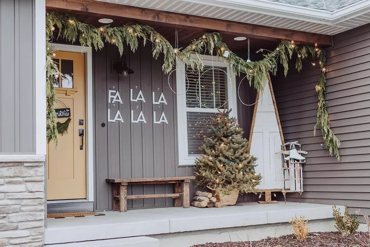 Nos encantan las formas no tradicionales de decorar para la temporada navideña, así que no nos cansamos de este porche moderno. Una corona minimalista simple adorna la puerta de entrada, pero las letras blancas que forman la palabra «fa la la» son un gran toque adicional para llamar la atención de tu vecino cuando pase por allí.