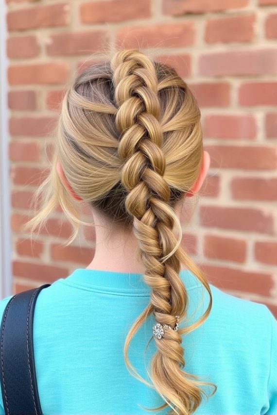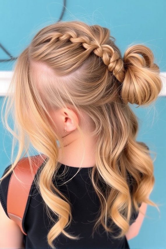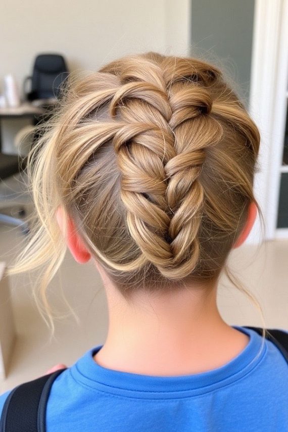 Este recogido con trenza holandesa es una forma elegante y práctica de mantener el cabello alejado de la nuca y del camino. Es perfecto para los días escolares activos y es sorprendentemente rápido de hacer. Solo haz una trenza en el centro y sujeta los extremos con horquillas. ¡Súper lindo y sin complicaciones!