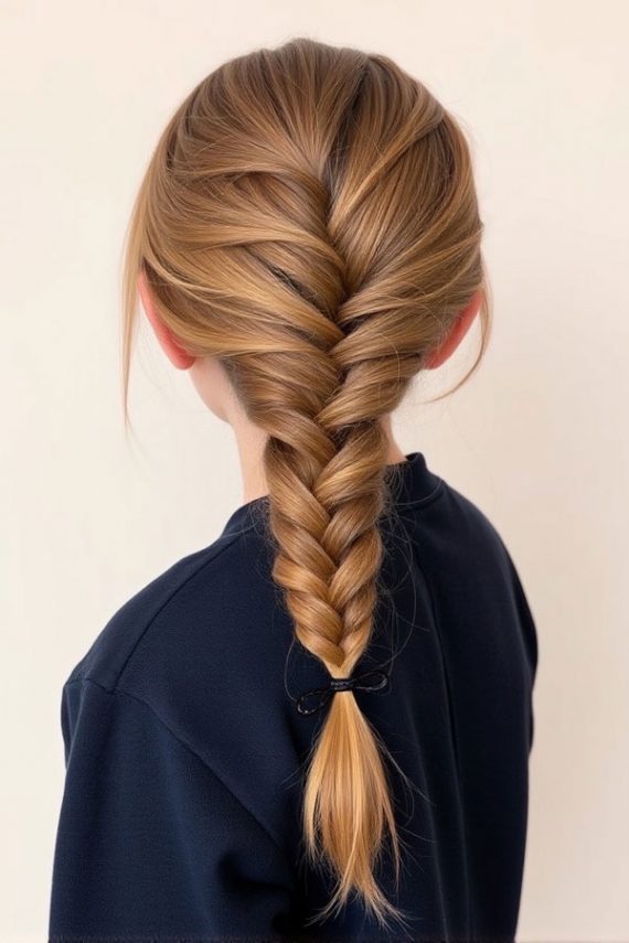 Esta sencilla trenza francesa es un look atemporal y elegante que funciona para cualquier día escolar. Es perfecta para mantener el cabello seguro y, al mismo tiempo, lucir linda y elegante. Solo haz una trenza de arriba hacia abajo y átala con una pequeña goma elástica en el extremo. ¡Es rápido y fácil!