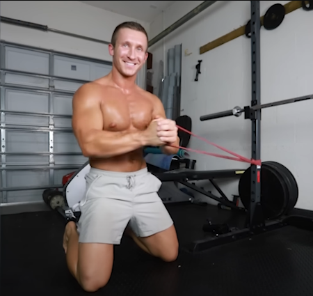 Comienza anclando una banda a una rejilla para sentadillas, un poste o algo similar, asegurándola alrededor de la altura del pecho o el estómago a un lado de tu cuerpo. Desde aquí, te arrodillarás y agarrarás la banda con ambas manos.