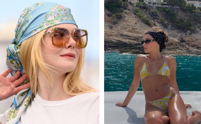 Bandana estilo pañuelo francés: cruzada por debajo del cabello y anudada en la parte superior, como lo hacen las celebridades en festivales de moda o en sesiones editoriales.