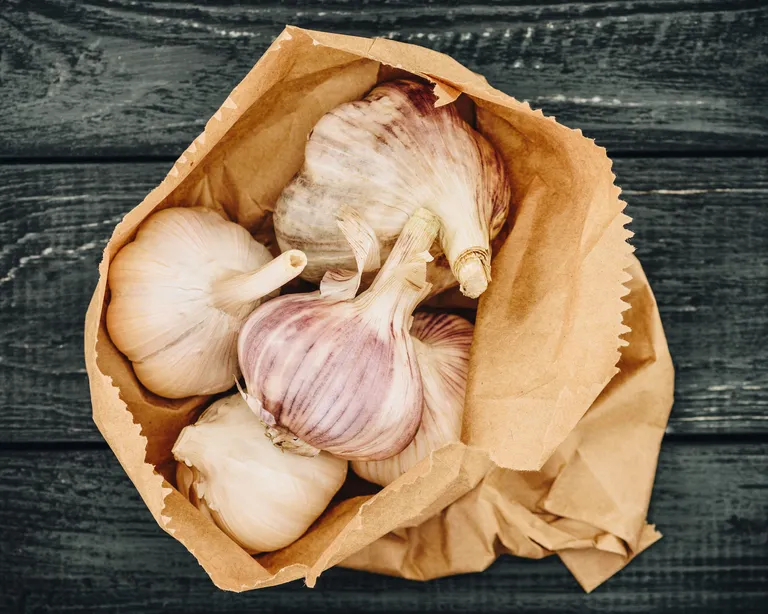 De lo contrario, coloca los bulbos de ajo en una bolsa de papel marrón y guárdalos en el refrigerador durante 6 a 10 semanas a una temperatura de 39 °F, revisando de vez en cuando para asegurarte de que no se hayan enmohecido por exposición al exceso de humedad.