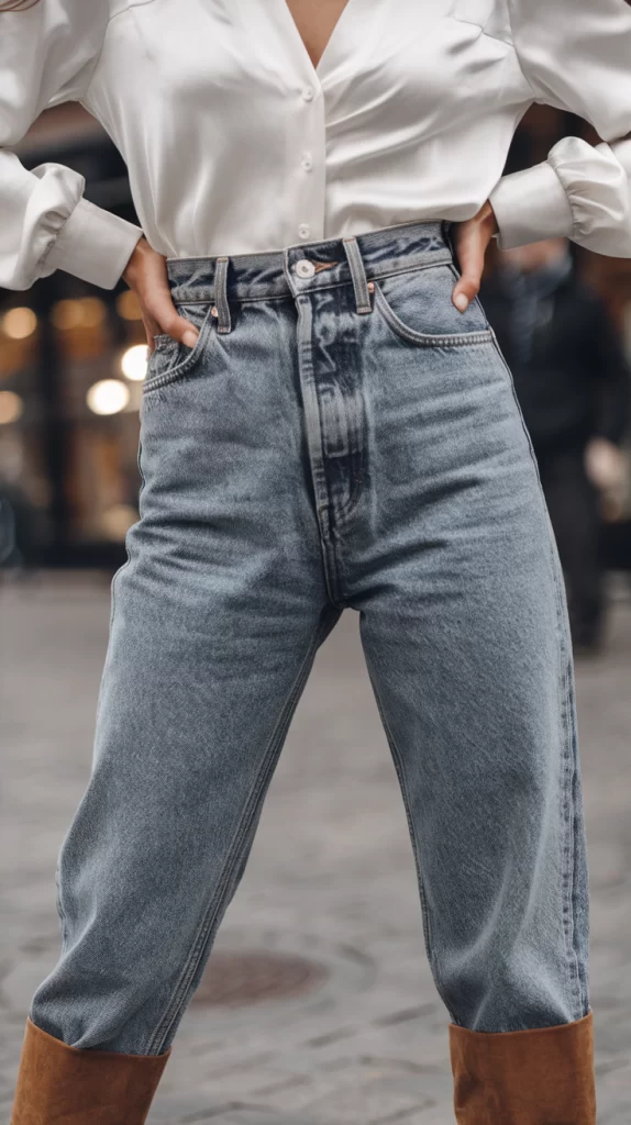 Los jeans de corte recto o bootcut (con una ligera campana en el tobillo) son ideales para equilibrar la figura, especialmente si tienes caderas anchas. Este estilo crea una línea continua desde la cadera hasta el pie, lo que ayuda a alargar la silueta y a disimular cualquier volumen adicional en la zona del abdomen.