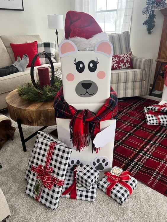 OSO POLAR NAVIDEÑO: Como puedes ver, este oso polar, elaborado con cajas de cartón decoradas, es un adorno encantador que demuestra cómo reutilizar materiales simples para crear algo único y festivo en tu decoración navideña.