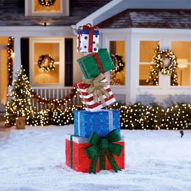 PATIO DECORADO: Imagina una torre de regalos colorida, hecha con cajas de cartón recicladas y decoradas con detalles brillantes. Como ves, este adorno navideño creativo transforma materiales simples en una pieza personalizada que añade magia a tu hogar.