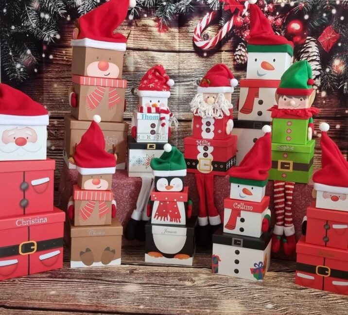 CAJAS DE REGALOS PARA DECORAR EXTERIORES: Sin duda, la magia navideña empieza en la puerta de tu hogar. Adorna la entrada con un Santa Claus y regalos decorativos para crear un rincón acogedor que captura la esencia festiva desde el primer momento.