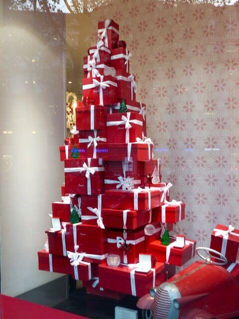 ÁRBOL DE NAVIDAD DECORADO CON CAJAS: Este árbol de Navidad decorado con cajas de regalo decoradas no solo es un adorno encantador, sino también un ejemplo de cómo se pueden reutilizar materiales simples para crear algo único y festivo.