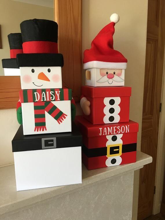 PARA DECORAR RINCONES: Estos muñecos de nieve y Santa Claus, hechos a mano con cajas de cartón decoradas, son adornos encantadores que reutilizan materiales simples, creando piezas únicas y festivas que dan vida a cualquier rincón.