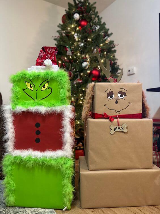 DECORACIÓN INSPIRADA EN EL GRICH: Añadir creatividad al envoltorio de regalos puede transformar las festividades. Inspirarse en El Grinch y Max no solo embellece los paquetes, sino que también añade sorpresa y alegría a la Navidad.