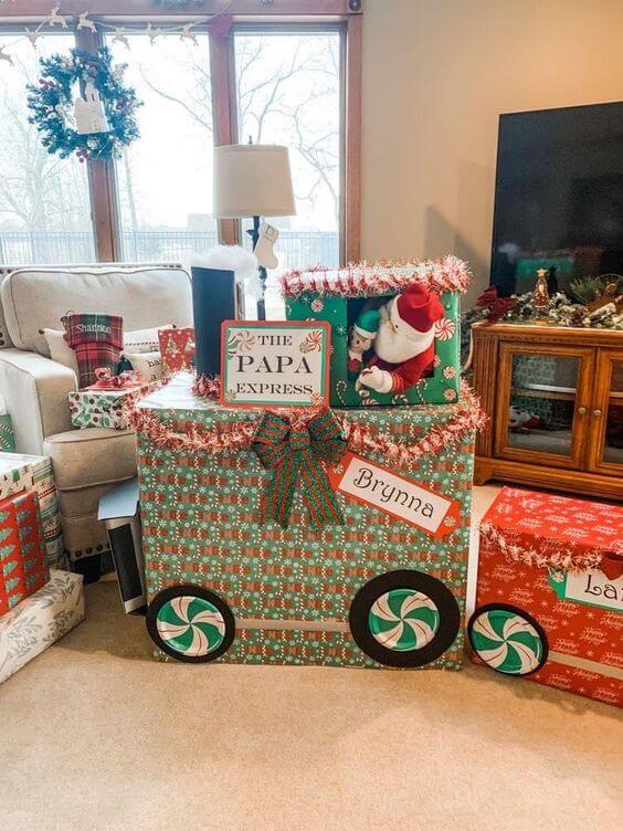 TREN NAVIDEÑO: Como puedes ver, este tren de regalos, hecho con cajas de cartón recicladas, añade un toque festivo y divertido a la decoración. Además, demuestra cómo reutilizar materiales simples para crear algo especial y personalizado.