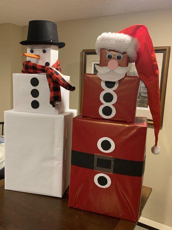 SANTA Y MUÑECO DE NIEVE: Estos muñecos hechos a mano con cajas de cartón recicladas, son un ejemplo perfecto de cómo se puede utilizar materiales de reciclaje para crear adornos encantadores. Además, son excelente para decorar interiores y exteriores.