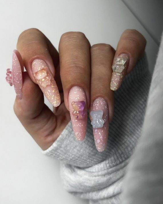 El tono suave y neutro de las uñas en forma de almendra proporciona un lienzo elegante, lo que permite que los divertidos detalles de gelatina destaquen. Colocados delicadamente sobre cada uña, estos dulces adornos agregan un toque de encanto y personalidad a las yemas de tus dedos. Perfectas para quienes aprecian el arte de uñas único y creativo, las uñas almendradas nude con adornos de gelatina de bebé ofrecen una manicura encantadora y llamativa que seguramente provocará alegría dondequiera que vayas.