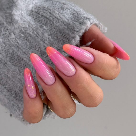 Esta llamativa manicura combina a la perfección los tonos cálidos del naranja con los suaves matices del rosa, creando un cautivador efecto degradado. La forma almendrada añade un toque de elegancia y sofisticación a las uñas, mientras que el diseño ombré aporta un toque divertido y contemporáneo. Ya sea que estés tomando el sol en un día de verano o alegrando un día sombrío, estas uñas seguro que te levantarán el ánimo y dejarán una impresión audaz dondequiera que vayas.