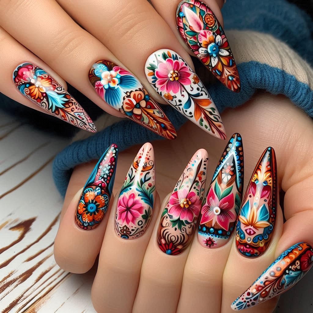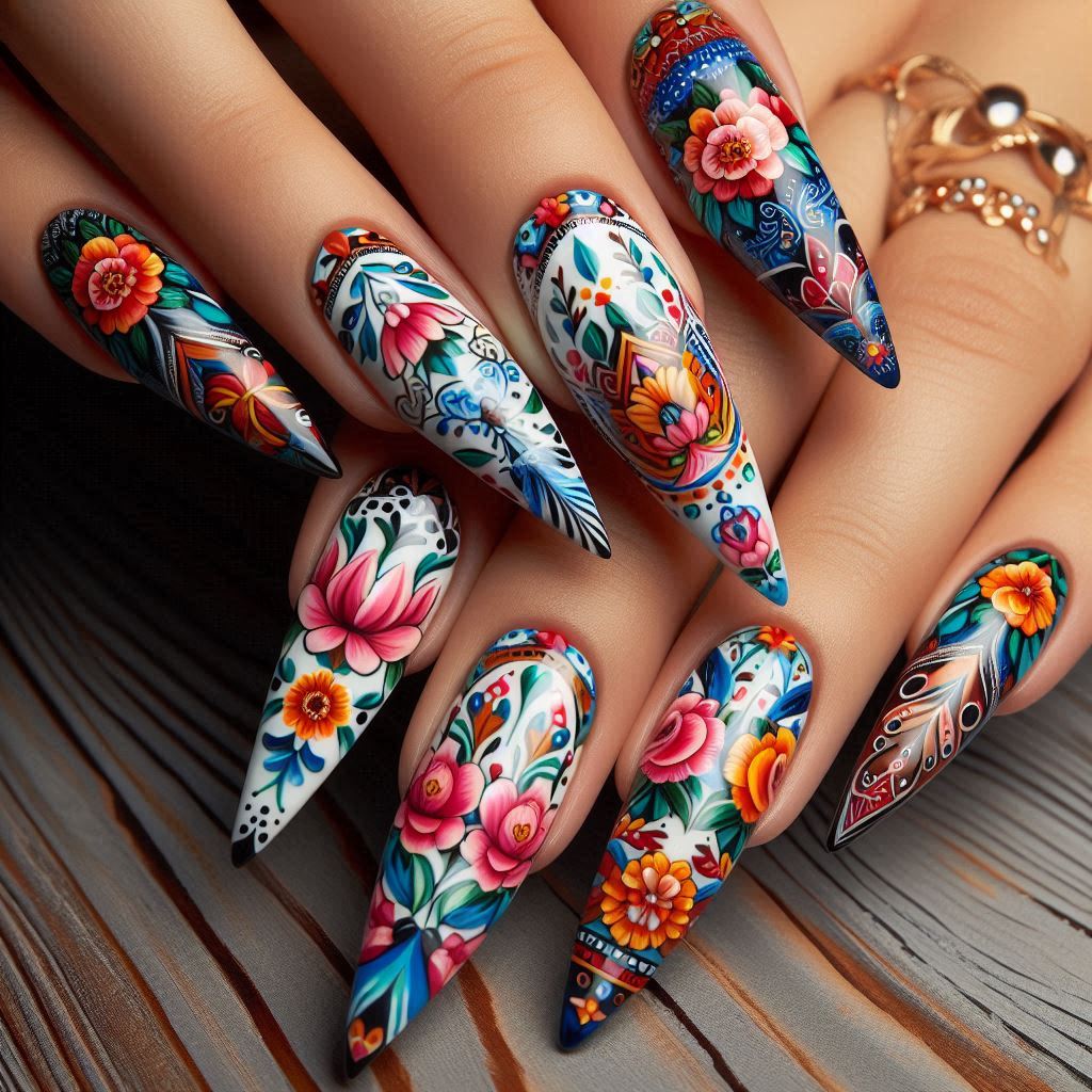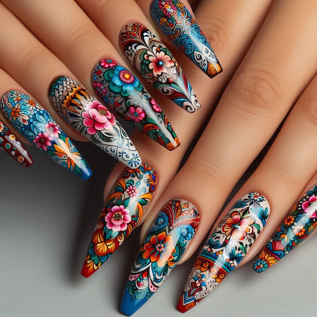 La cerámica Talavera es uno de los elementos artesanales más representativos de México. Sus patrones intrincados y colores vivos son ideales para un diseño de uñas único. Puedes optar por un fondo blanco con detalles en azul, amarillo y naranja, recreando los patrones clásicos de la Talavera.