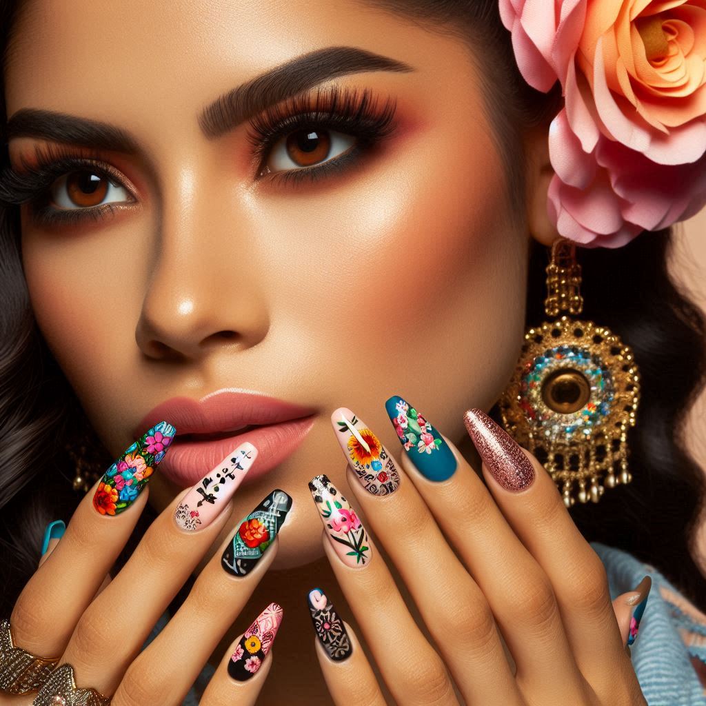 La cerámica Talavera es uno de los elementos artesanales más representativos de México. Sus patrones intrincados y colores vivos son ideales para un diseño de uñas único. Puedes optar por un fondo blanco con detalles en azul, amarillo y naranja, recreando los patrones clásicos de la Talavera.