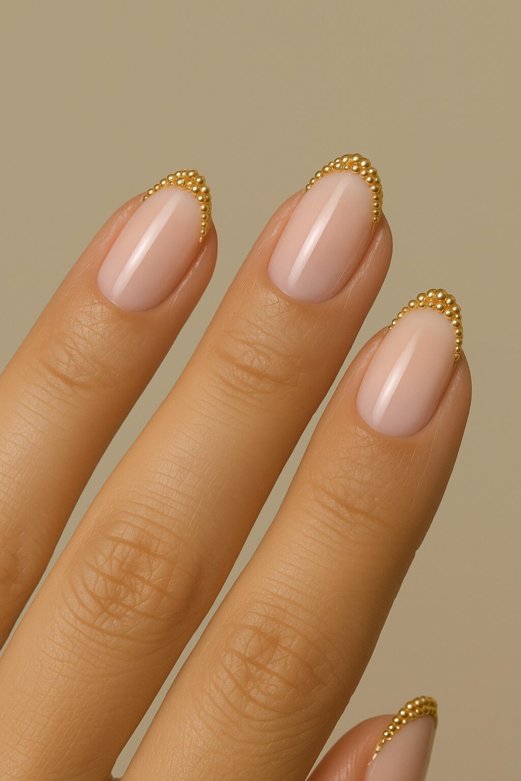 Luego se colocan cuentas doradas pequeñas (tipo joyería de uñas) con gel especial.