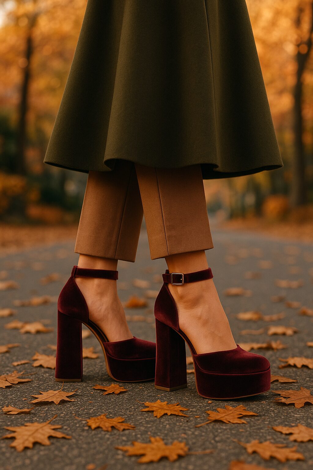 Lejos quedaron los diseños exagerados de temporadas anteriores. Este otoño, las plataformas adoptan una estética más depurada y sofisticada. Materiales como el charol, el terciopelo y el cuero suave dominan la escena, mientras que los colores se alinean con los tonos típicos de la temporada: burdeos, camel, verde oliva, negro intenso y algunos destellos metálicos para la noche.