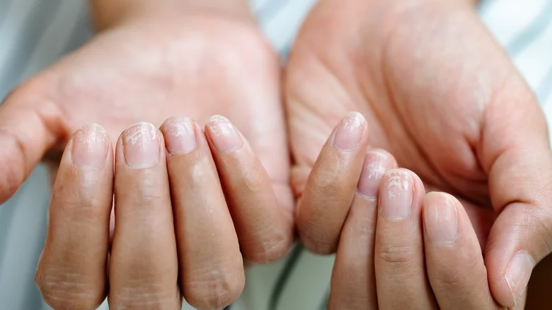 Además del color de las uñas, la sensación física de las mismas también puede ser un indicio de la afección. Las personas que padecen esta afección suelen tener las uñas escamosas y partidas, especialmente en las puntas, de ahí el nombre de «cáscara de huevo».